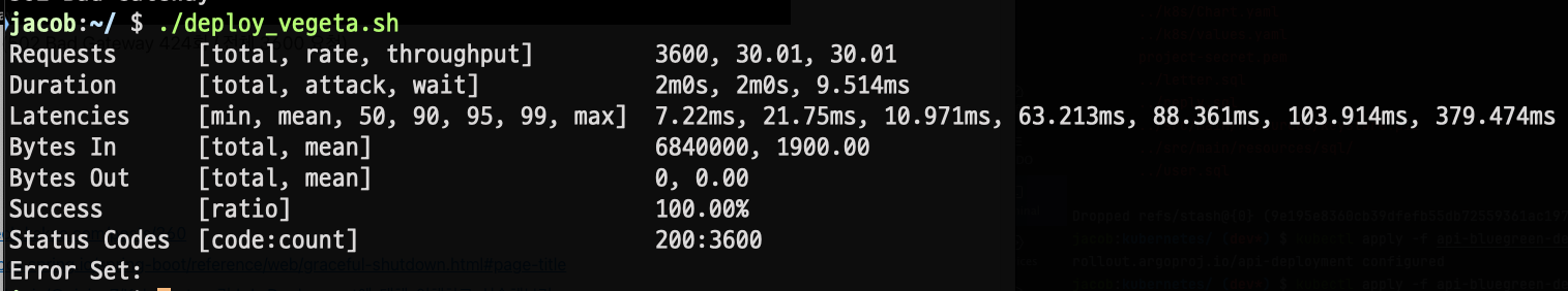 위의 이미지를 보시면 Spring 애플리케이션에서 graceful shutdown이 되도록 설정했음에도 로드 중인 파드에 트래픽을 보내 유실된 것을 확인할 수 있습니다.