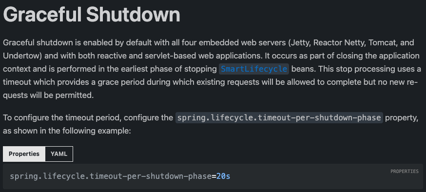 기본적으로 네 가지(Tomcat, Jetty, Reactor Netty, Undertow) 임베디드 웹 서버에 대해 지원하며, 기존 처리가 완료될 때까지 제한 시간도 설정할 수 있습니다.
