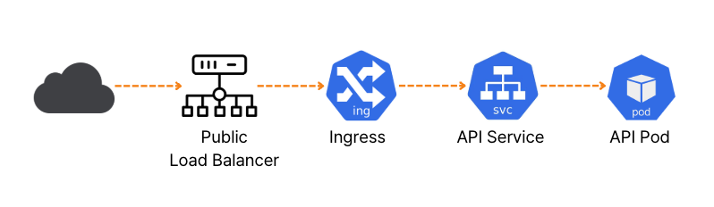 Ingress는 Public Load Balancer로부터 트래픽을 받고, path에 따라 특정 서비스로 라우팅 합니다.