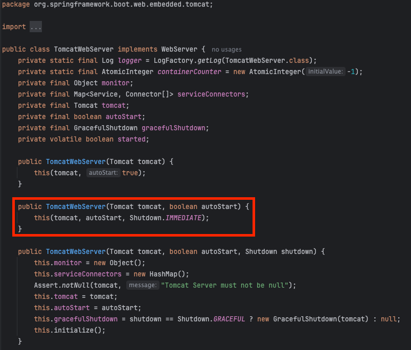 `org.springframework.boot.web.embedded.tomcat.TomcatWebServer`에서 기본값으로 `IMMEDIATE`인 것을 확인할 수 있습니다.