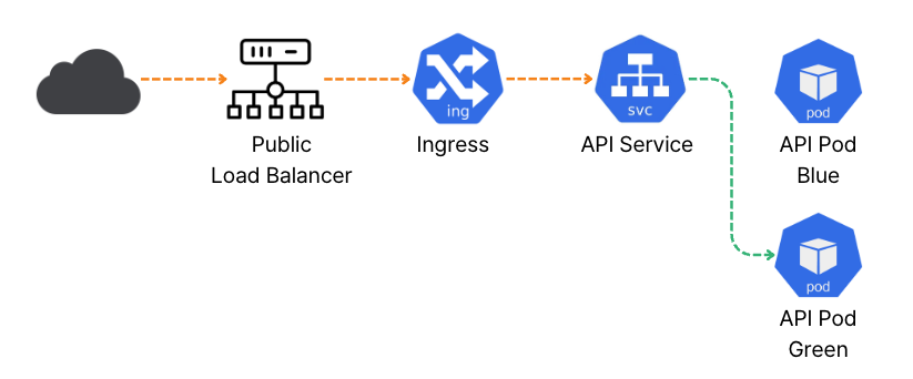 `Green` 버전 파드가 트래픽을 정상적으로 처리할 수 있는 상태가 되면 서비스가 `Green` 버전 파드를 바라보도록 수정합니다.