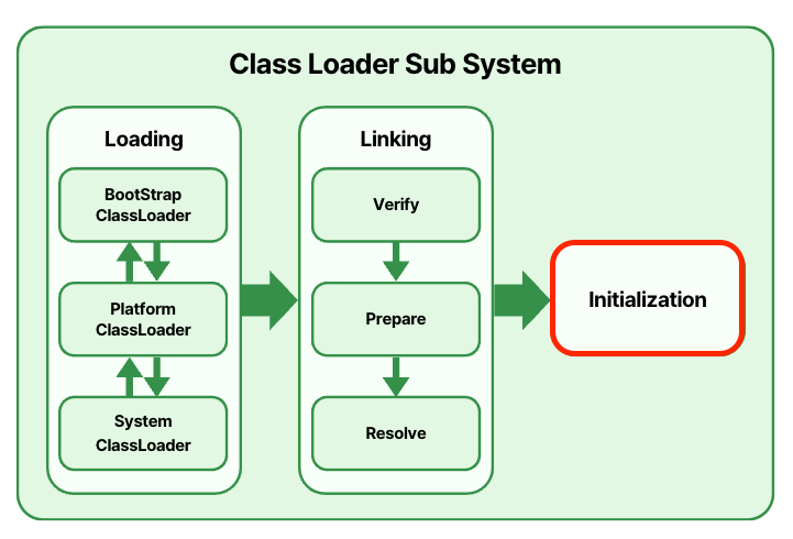 - Initialization: 클래스의 정적 초기화 블록(`static {}`)을 실행하며, 정적 필드(static field)를 사용자가 지정한 값으로 초기화한다.