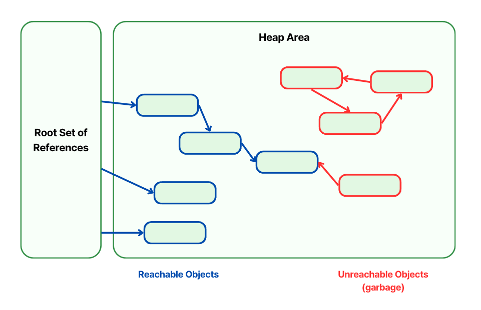 위 그림을 보면 root set으로부터 참조 사슬이 연결된 객체들은 유효한 참조라고 보기 때문에 Reachable, 그렇지 않은 객체들은 Unreachable이다.