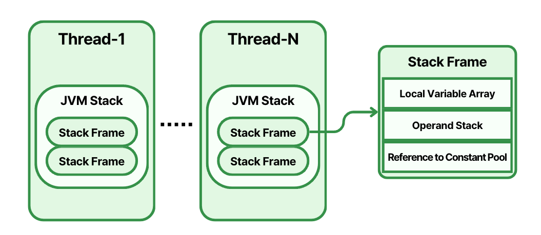 - JVM Stack: 스레드가 생성될 때마다 함께 생성되어 스레드에 할당된다. JVM Stack은 메서드가 호출 때마다 Stack Frame(스택 프레임)을 push하고, 메서드가 종료되면 pop을 수행하는 것만 한다.