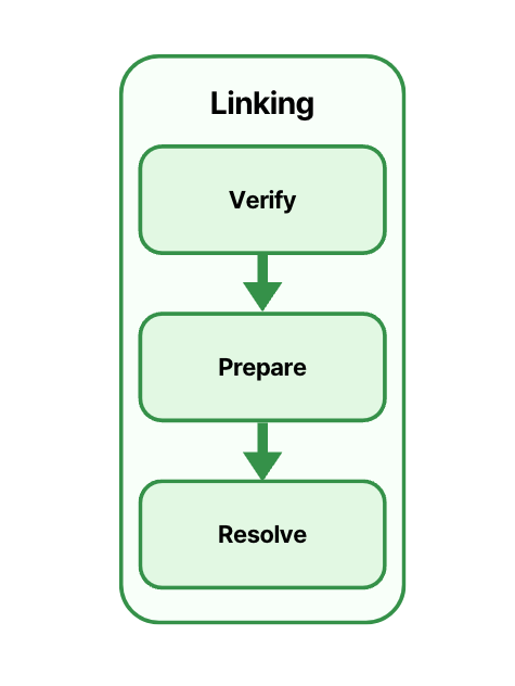 - Linking: Verify → Prepare → Resolve 단계를 순서대로 거쳐 실행을 준비한다. 세부 내용은 뒤에서 다룬다.