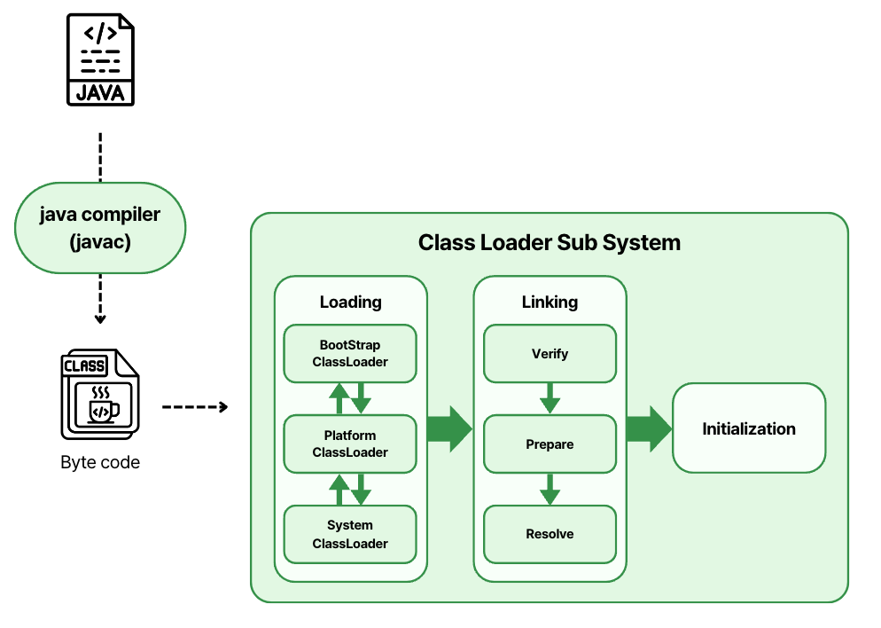 - Class Loader SubSystem: 클래스를 동적으로 로드하고, 로딩된 클래스를 메모리로 관리한다. 클래스를 로드하는 과정은 다시 세 부분으로 나눈다.