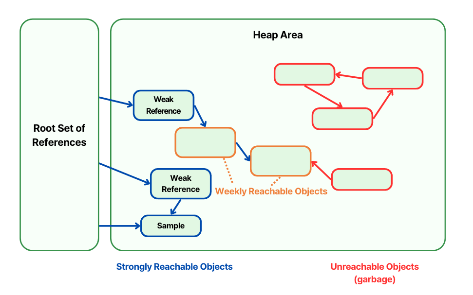 여기서 `new WeakReference()`로 생성된 객체는 reference object, `new Sample()`로 생성된 객체는 referent 이다.