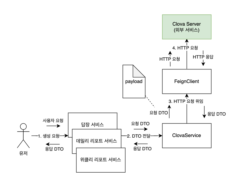 이때 아래 이미지와 같이 HTTP 요청과 응답은 FeignClient가 맡고있으며, Clova API 관련 payload(요청 헤더, API KEY 등)는 ClovaService가 책임을 맡는 구조입니다.