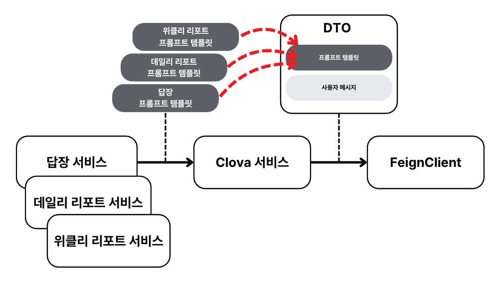 또한 메시지(`생성형 AI API에게 전달하라`)는 동일하지만 메시지를 수신하는 인터페이스가 중복되며 일관성이 없습니다. 특히 위클리 리포트의 경우 `WeeklyReportRequestDto` 클래스를 전달해 일관성을 깨뜨립니다. - SRP 위반: ClovaService가 `답장 서비스`에서만 사용되는 `extract()` 인터페이스를 갖고 있습니다.