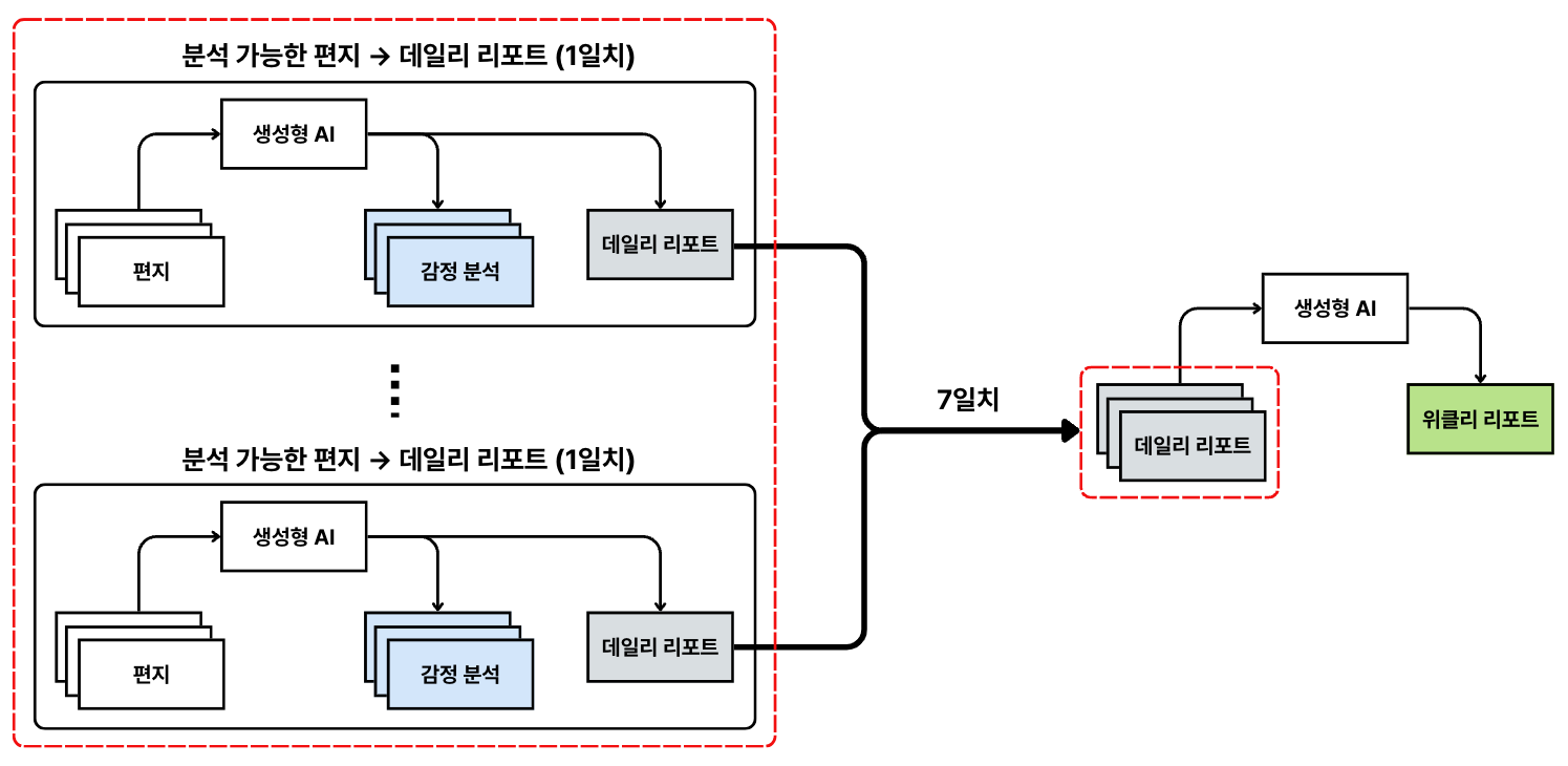 현실적으로 16만 글자를 생성형 AI에게 전달하는 것은 비용 문제와 서비스 품질 문제로 이어질 수 있기 때문에 `데일리 리포트`를 이용하는데요, `데일리 리포트`에 하루치가 요약되어 있는 내용을 이용해 `위클리 리포트`를 생성합니다.