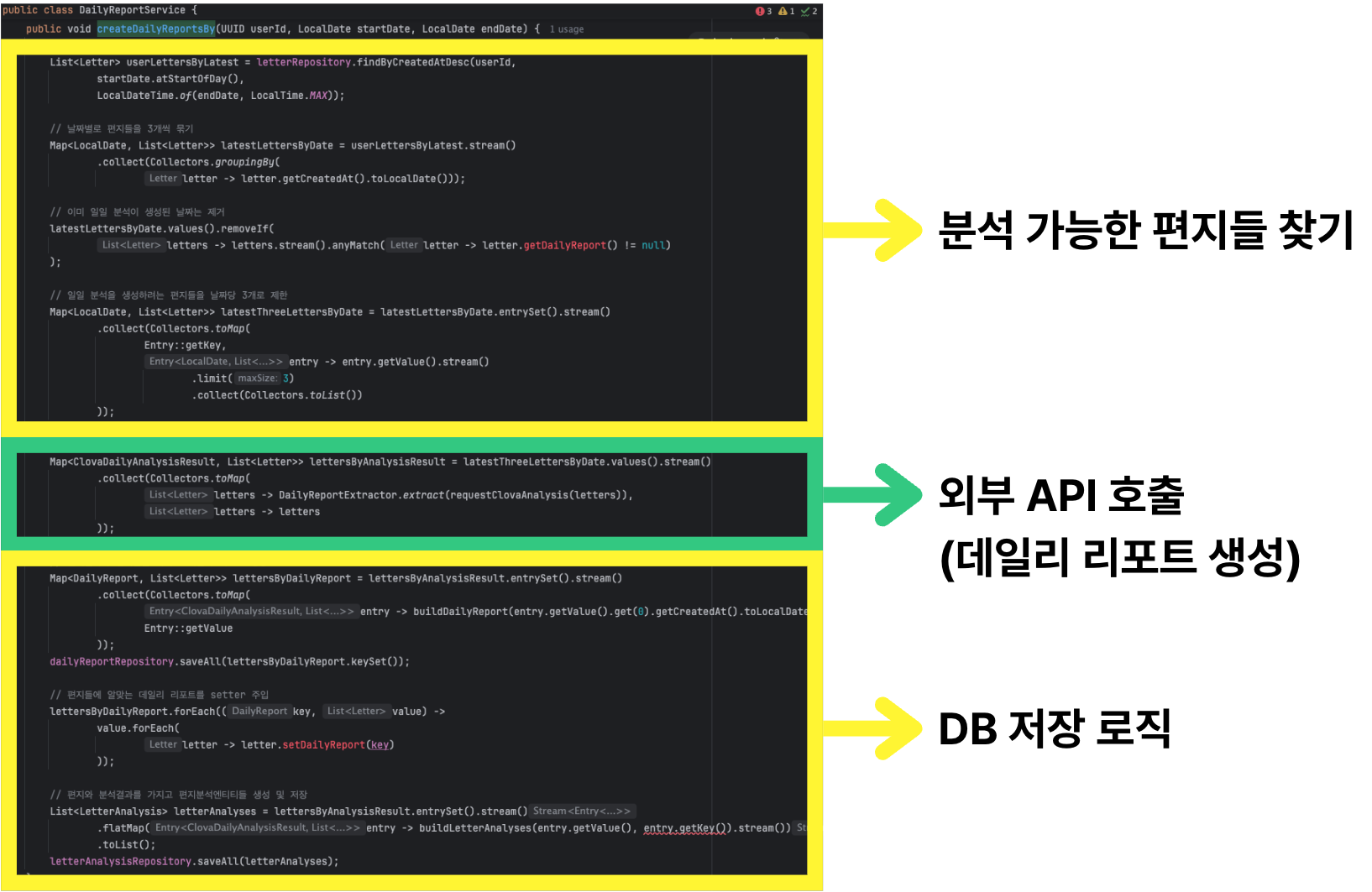 호출되는 데일리 리포트 서비스의 메서드입니다. (전체 그림에서 왼쪽 부분)