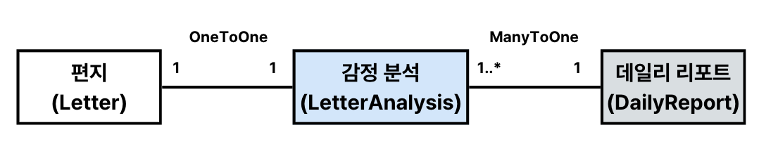 이전 포스팅(도메인 모델을 리팩토링)에서 리팩토링한 결과로 `편지`와 `데일리 리포트`와 연관 관계를 아래 그림처럼 갖고 있습니다.