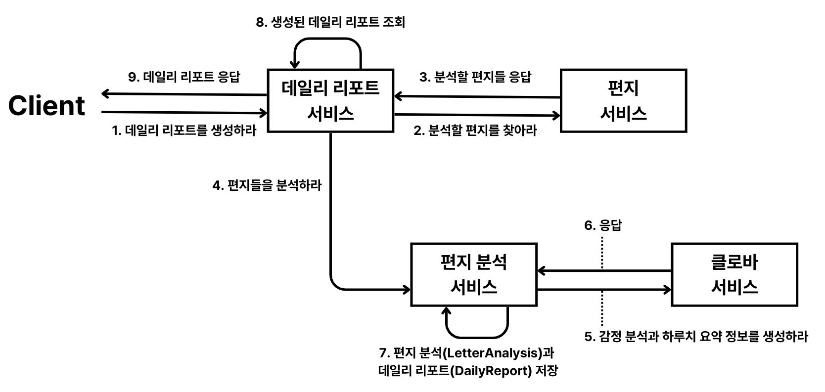 - 이제 편지 분석과 데일리 리포트 생성의 책임은 `편지 분석 서비스`에게 할당되었기 때문에 생성과 저장에 있어서 변경 사항이 `데일리 리포트 서비스`까지 전파되지 않습니다.