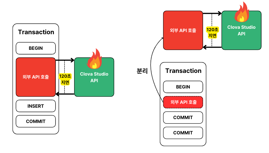 아래 그림은 문제가 되는 외부 API 호출하는 부분을 트랜잭션에서 분리하기 위해서 `외부 API를 호출하는 부분`과 `결과를 저장하는 부분`을 나눈 것을 보여줍니다.