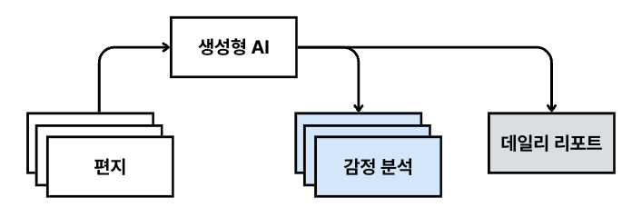 위의 그림은 프로젝트에서 생성형 AI가 편지들을 분석한 결과를 이용해 감정 분석(LetterAnalysis)과 데일리 리포트(DailyReport) 엔티티가 생성되는 흐름을 보여줍니다.