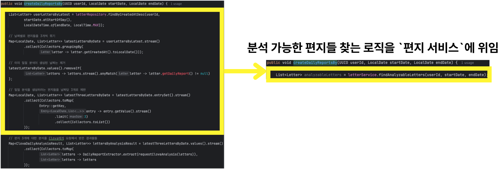 요점은 `List<Letter>` 타입만으로 `분석 가능한 편지들`을 `clovaService`를 이용해 생성형 AI에게 전달하고, 분석 결과를 받는다는 의미를 파악하기 어렵다는 것입니다.