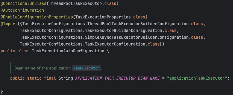 등록 과정은 `@SpringBootApplication` → `@EnableAutoConfiguration`에 의해 `TaskExecutionAutoConfiguration`가 등록되고, 내부 설정 값으로 `TaskExecutionProperties`를 이용합니다.