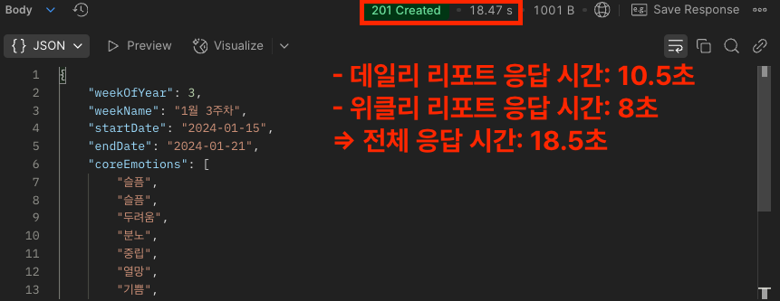 위클리 리포트까지 생성하는데 걸리는 시간은 약 18.5초가 걸렸습니다. (데일리 리포트 생성: 10.5초 + 위클리 리포트 생성: 8초)