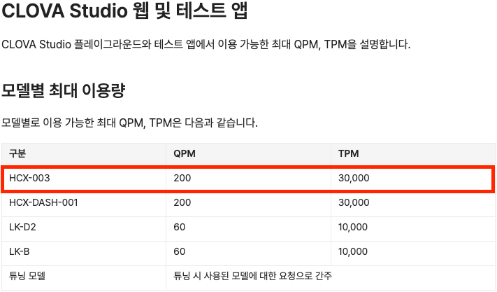 - TPM(Tokens Per Minute, 분당 처리할 토큰 수): 30,000 (테스트 앱) | 180,000 (서비스 앱)